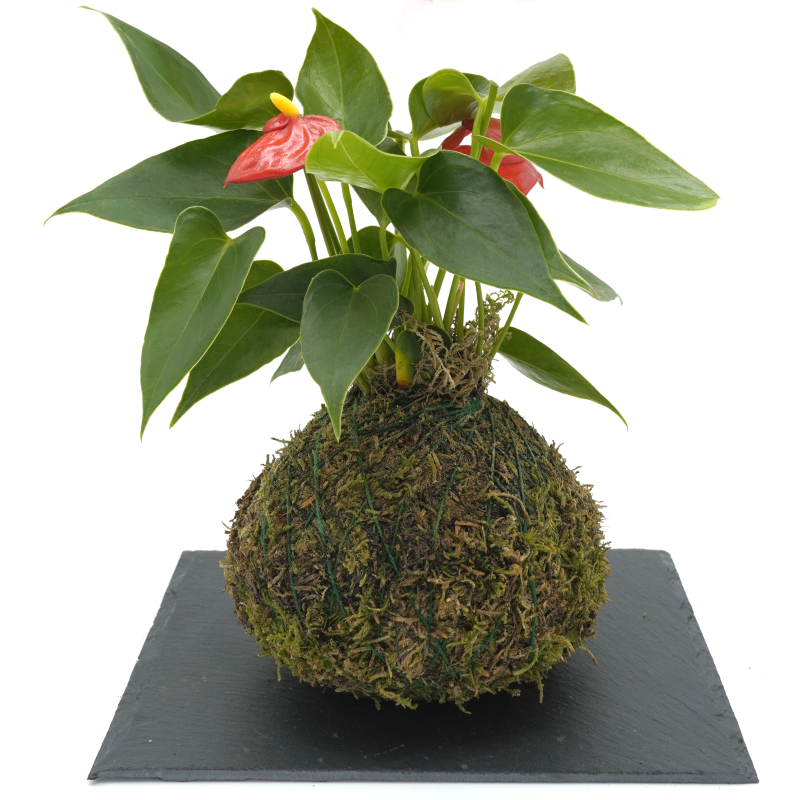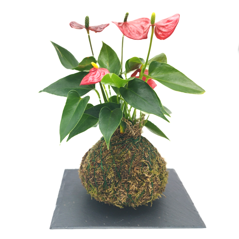 Para mantener la kokedama de tu Anturio bien hidratada, es importante sumergir la bola de musgo en agua cuando notes que está comenzando a secarse. Déjala en remojo durante 10-15 minutos y, una vez que esté bien empapada, deja escurrir el exceso de agua antes de devolverla a su lugar. En épocas más cálidas necesitarán más agua, mientras que en invierno es aconsejable reducir la frecuencia de riego.