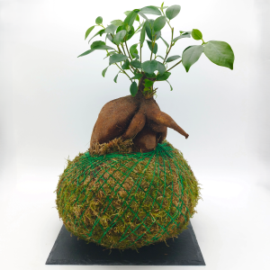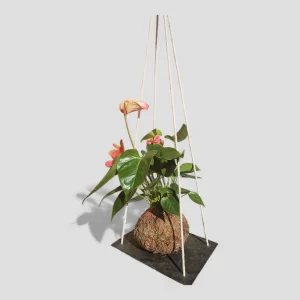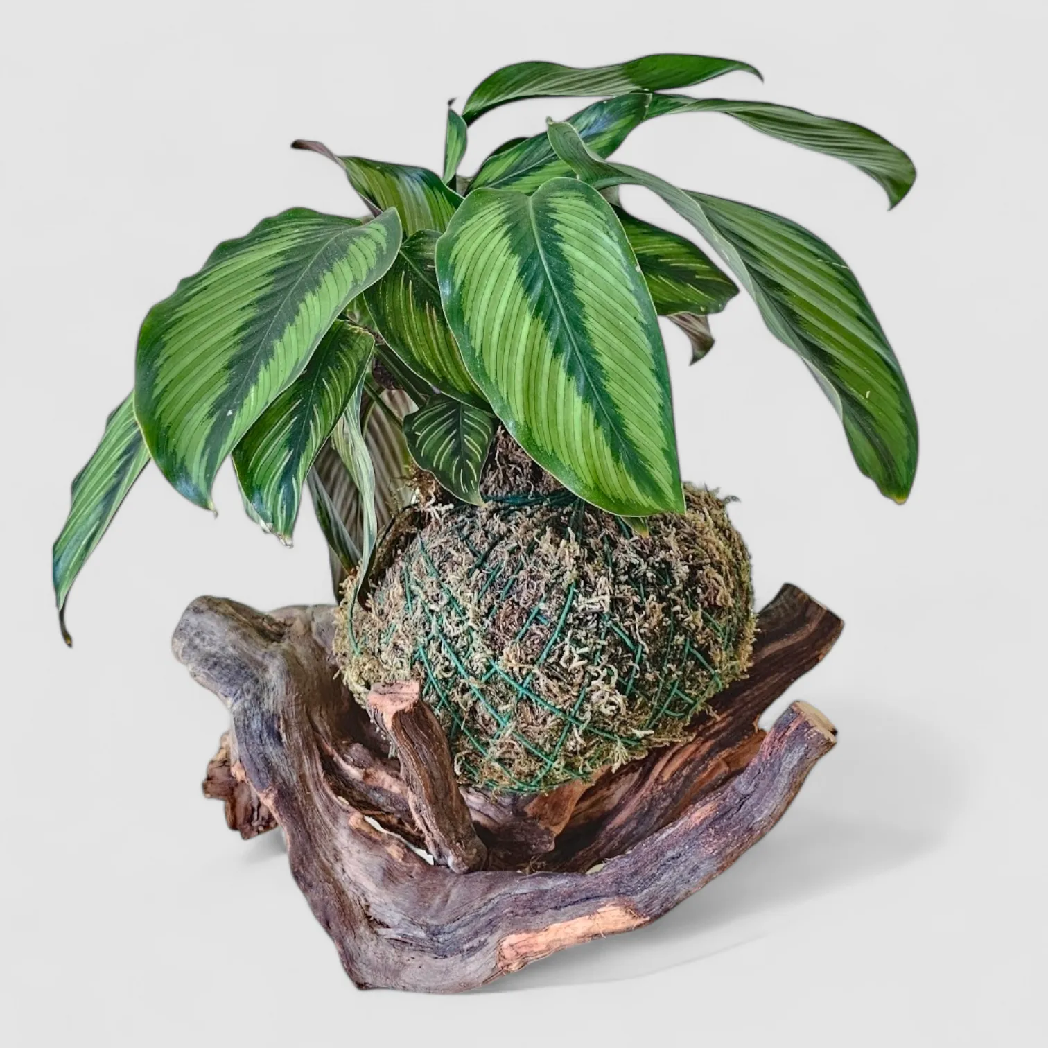 Para mantener la kokedama de la Calathea Warscewiczii bien hidratada, sumerja la bola de musgo en agua cuando comience a sentirse seca al tacto. Deja la kokedama sumergida durante unos 10-15 minutos y asegúrate de que escurra el exceso de agua antes de devolverla a su lugar. Ajuste el riego según el clima, más frecuente en épocas cálidas y espaciados durante el invierno.